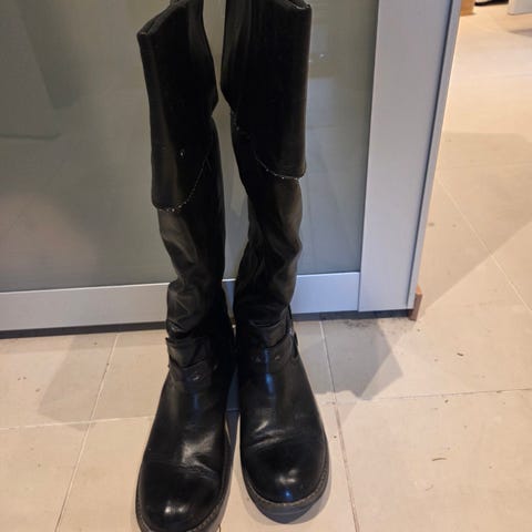 Roots støvler i størrelse 40, designet for damer. Støvlene er svarte og laget av skinnmateriale. De har en solid gummisåle med mønster for grep. Støvlene har glidelås på innsiden for enkel på- og avkledning. Nypris var 1700kr.