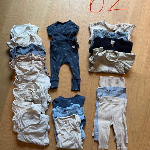 Fin klespakke med 21 plagg i størrelse 68 med ull, festklær og badebukse/badebleie.