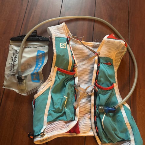 Tror dette er adv skin 5, men ikke den nyeste modellen. Pent brukt. Super løpevest med plass til softflasker i front, og en liten dunjakke og matpakke bak. I nettinglommene fremme og bak kan man stappe hansker, caps, solkrem, snacks og alt mulig småting. Perfekt for fjellturer på sommeren, eller kortere turer på vinteren.