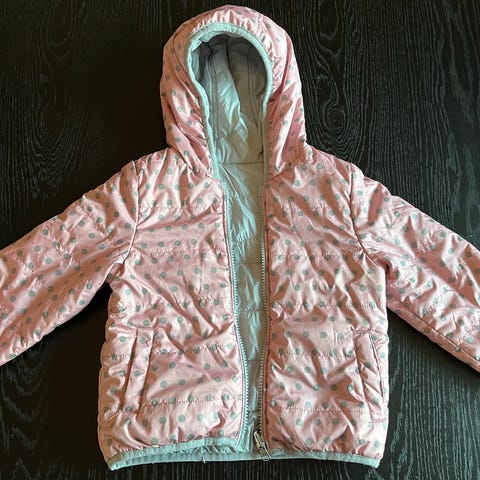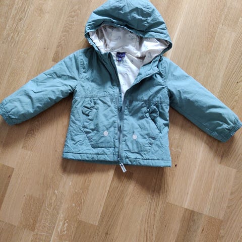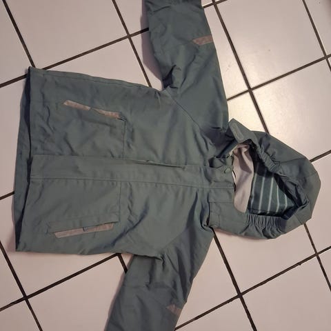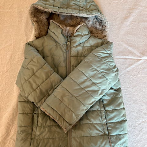 To i ett jakke. Flekker på det grønne ytterstoffet. Det grå pelsstoffet fremstår som ganske ubrukt. Varm.