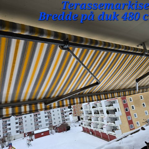 Ukjent merke markise stripet stoff, designet for montering på vegg med håndsveiv.