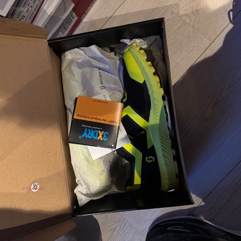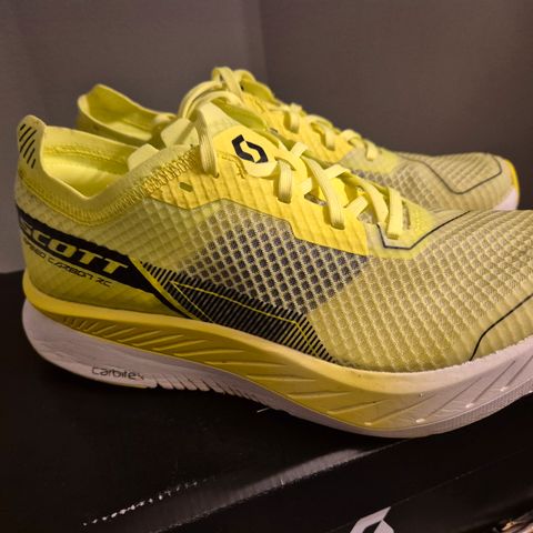 Scott løpesko i størrelse 38.5 Skoene har svart overdel med gule detaljer og gult yttersåle. Designet for løping med pustende materiale og demping for komfort.