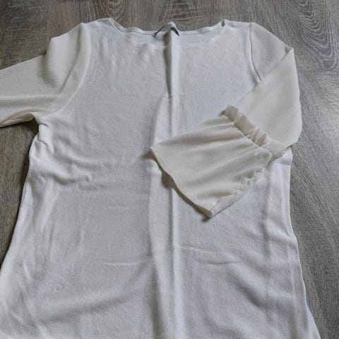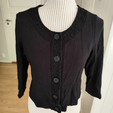 ONLY topp i svart farge, størrelse M for kvinner. Langermet topp med v-hals og puffede skuldre, laget i et elastisk materiale.