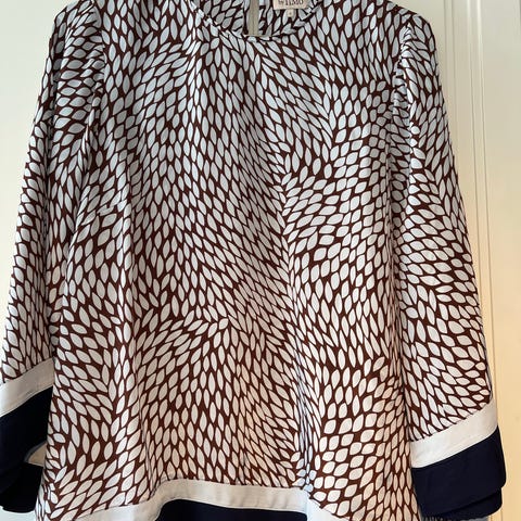 Pen bluse/ topp fra byTimo med 2/4 vide armer. Blusen har mønster i brun og lyseblå/sølv og kantet med bånd i blå og hvit. Nydelig til et par hvite bukser.