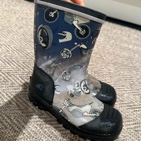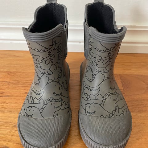 H&M barn gummistøvler i størrelse 27, unisex modell. Støvlene er grå med mønster og laget i gummimateriale, egnet for våte og gjørmete forhold.