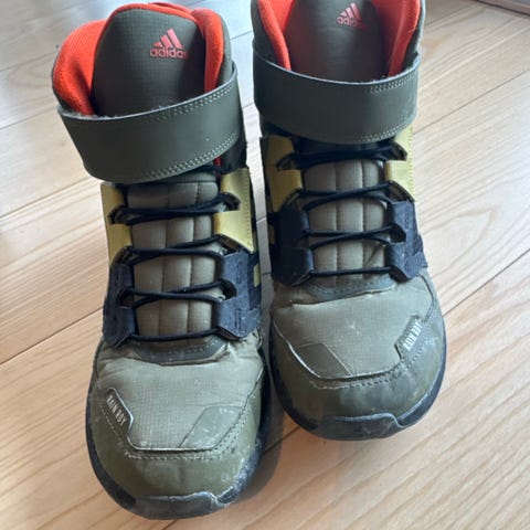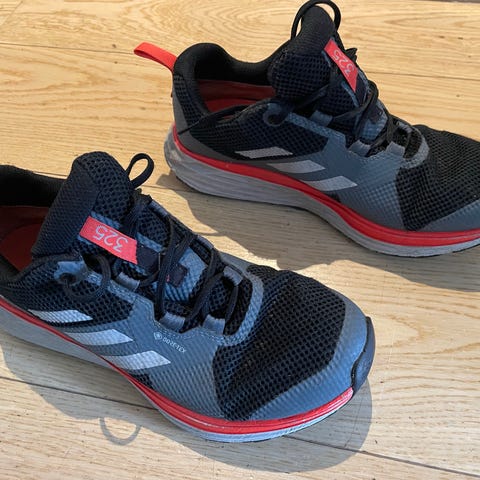 Tursko fra Adidas, str 40. Godt brukt, men mye sko igjen. Særlig slitt på innsidene, hvor det ytterste stoffet er delvis slitt av. Lite synlig under bruk. Trenger nye innleggssåler. Kule detaljer!