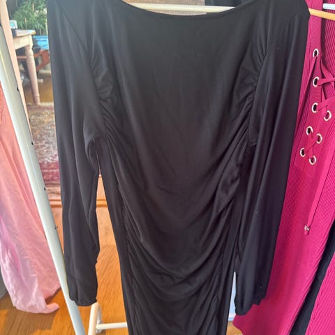 Gestuz festkjole i størrelse L, farge svart. Kjolen har et mønstret stoff med en delikat tekstur og langermet design. Passer til formelle anledninger og festbruk.Aldri brukt helt ny