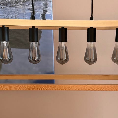Taklampe med fem pærer. Ser nesten ut som en fisketeine.