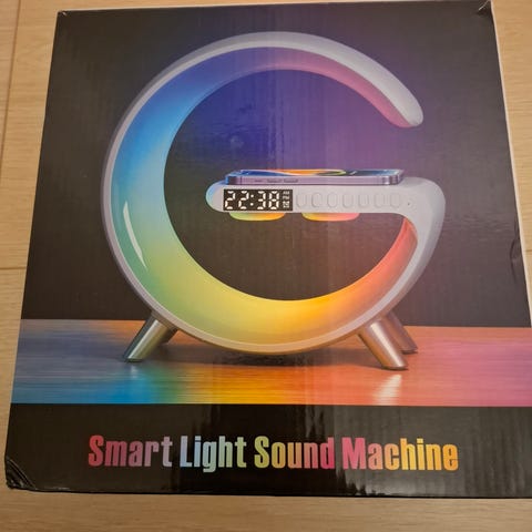 Gingko Smart Life Assistant vekkerklokke med LED-lys, trådløs lading, og naturlige søvnlyder. Klokken har en buet design med fargeskiftende LED-lys og viser tid digitalt. Funksjoner inkluderer soloppgangssimulering, alarmklokke, lydmaskin med 10 forskjellige lyder, og dimmefunksjon. Strømforsyning via 5V 2A adapter, LED-lys på 3W, og trådløs lading med 15W effekt.