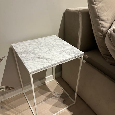2 stk stuebord/lampebord i ekte marmor fra møbelringen. Noen bruksmerker på bordene, se bilder. Merkene kan slipes bort. Merkene syns kun når lyset treffer på rett sted.