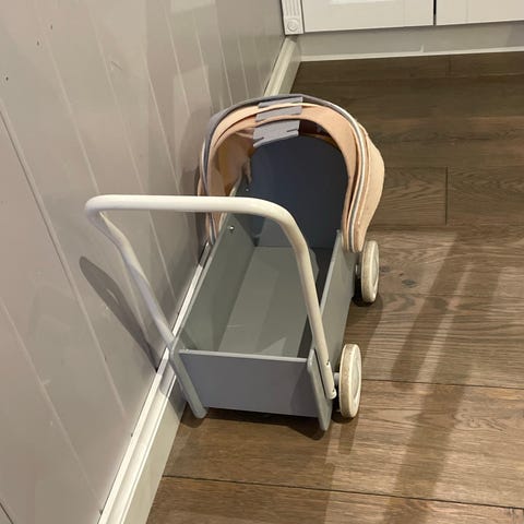 Dukkevogn med rosa og lilla mønster