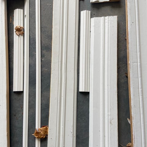 Gul treverk listverk bestående av 5 deler. Materialet er tre og listverket er malt gult. Det har synlige slitasjer og skader, noe som kan påvirke bruksområdet. Egnet for reparasjon eller gjenbruk i mindre kravfulle prosjekter.