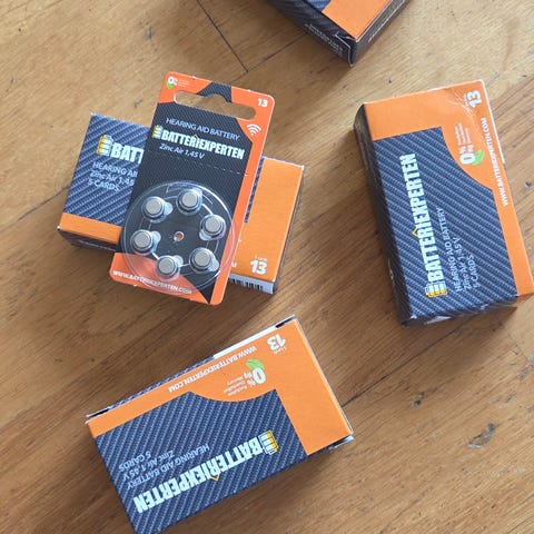 Rensetabletter (18 stk), proppeblåser og PVC-slange (45 cm) for vedlikehold av høreapparat. Kjøpt fra Eterno mai 2025.