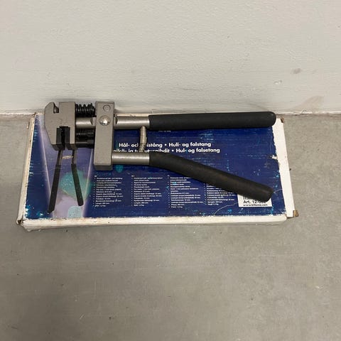 Multifunksjonelt hulltang verktøy med blå håndtak. Laget for å lage hull i ulike materialer. Håndtakene er belagt med blått materiale for bedre grep og komfort under bruk. Verktøyet har justerbare innstillinger for forskjellige hullstørrelser.