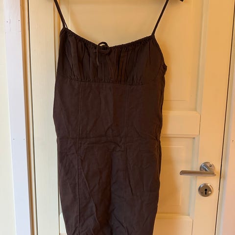 Rund hals. Korte ermer. Knelang. Skjult glidelås i ryggen. Pent brukt.