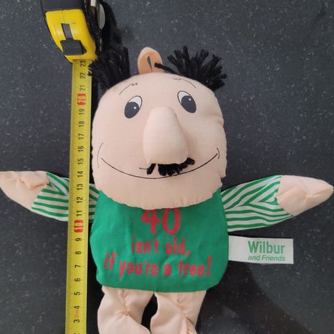 Bønnepose dukke fra 80 tallet med teksten "I love you sooo.... much"