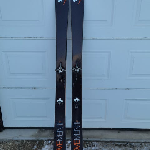 Movement apple er en konkurranse og treningsski for topptur. Binding er en kjøresterk og lett Dynafit Superlite med 12 DIN. Radius på skiene er 24 meter, og bredde er 98-65-79 mm og skien veier 770g. Skiene er beregnet for raske toppturer og skimo konkurranser. Skiene er i god stand, med noen små bruksriper i sålen.