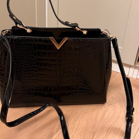 DKNY Dameveske laget av svart lær. Vesken har en quiltet design med en kjede- og lærrem for skulderbæring. Den har en magnetisk lukking og metalllogo på fronten. Innvendig fôr med mønster og flere rom for oppbevaring.