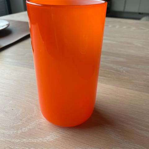 Vase i rosa glass. Dekorativt ornament som kan brukes til blomster eller som interiørdetalj. Laget av glass med en glatt overflate og en konisk form. 13 cm x 23 cm.