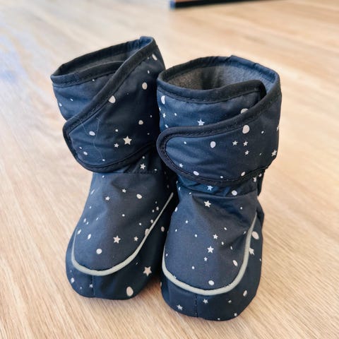H&M Barne sko for unisex, størrelse 16/18. Er mørkeblå med et mønster av hvite stjerner og planeter.