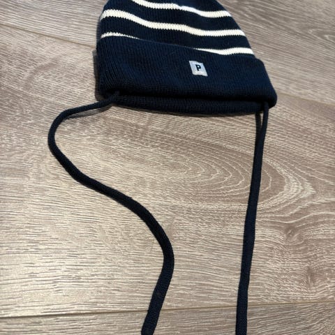 Selger en pent brukt Polarn O Pyret klaffelue. Mørk blå med hvite striper. Str 52/54, 2-9 år. 50% ull, 50% akryl.