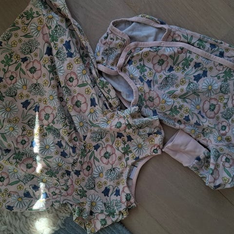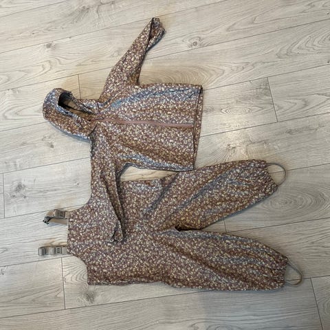 Joggedress for jente i størrelse 140. Sett med genser og bukse i flerfarget mønster med pastellfarger. Genseren har lange ermer og ribbekanter. Buksen har lange ben og elastisk linning. Egnet som hverdags- og koseplagg for barn i aktuell størrelse.
