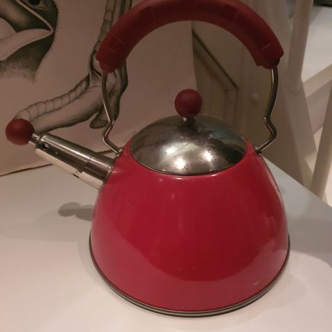 En sjarmerende og koselig retro kaffekjel emaljert med teakdetaljer. Formgitt i 1978 i Finland av Heikki Orvola for Arabia. Kaffekannen er kjøpt i en gjenbruksbutikk. Jeg har aldri brukt den, og selv om det er noen hakk i teakholderen i lokket, kan den være ubrukt eller i alle fall lite brukt. Jeg vet ikke. Se bilder av kjelen inni og under, og for øvrig utenpå. Mottakelig for bud.