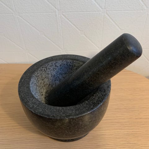 Solid morter, lite brukt, kun til krydder og urter. 11 cm høy, indre diameter 11,5 cm, ytre diameter 16 cm.