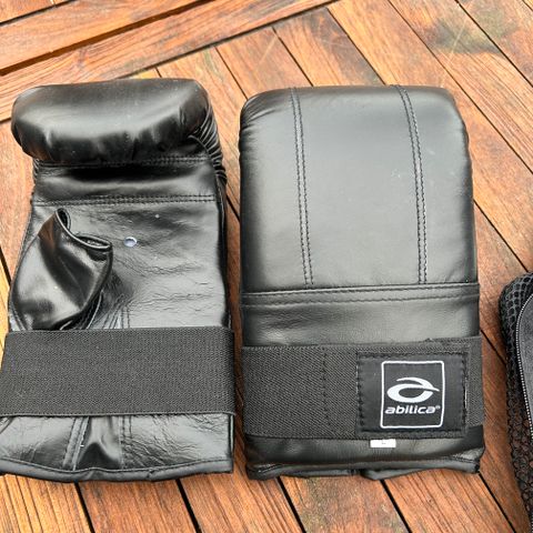 Hanskene har borrelåsfeste rundt håndleddet for justerbar passform og støtte. De leveres med en svart nettingpose for oppbevaring. Egnet for trening og kampsport.