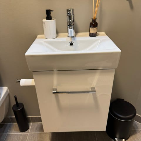 Selger hele settet samlet. Vask 80 cm med 2 skuffer, oras blandebatteri, speil med ledd lampe og sideskap 30 cm.