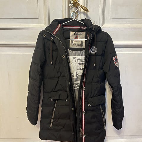 Godt brukt parkas i str small. Ingen hull eller ødeleggelser, men synlig brukt rund halsen. Går helt sikkert av i vask. Mørk blå farge.