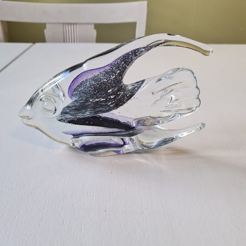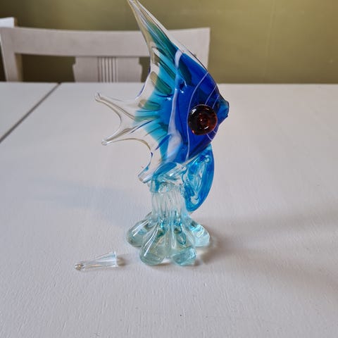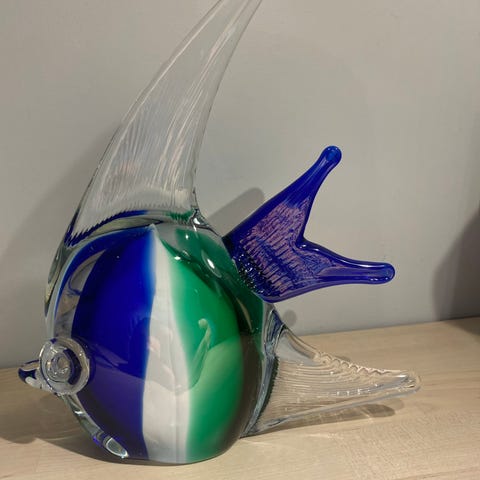 Glassfisk dekorasjon laget av klart glass med blå detaljer i midten. Dekorasjonen har en størrelse som passer til håndholdt visning og kan brukes som pynt i hjem eller kontor.