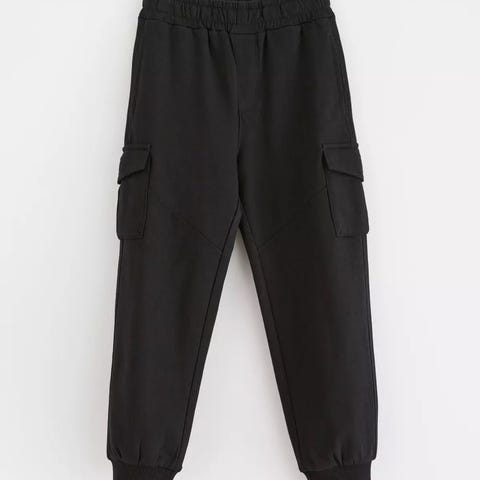 Lindex Kids joggebukse i svart farge, størrelse 128, passer barn i alderen 7-8 år. Unisex design laget i komfortabelt materiale. Buksen har elastisk midje med snøring og ribbestrikk ved anklene.