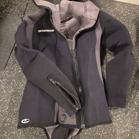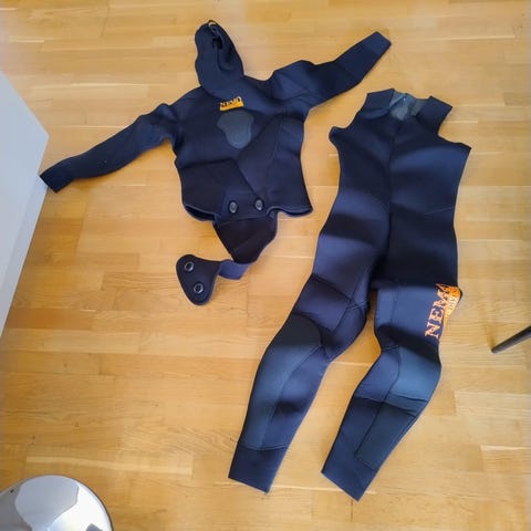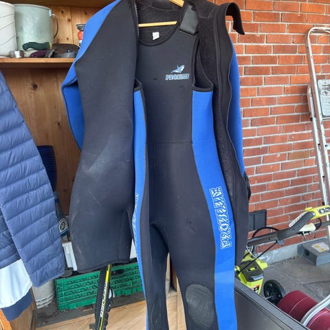 Pent brukt våtdrakt. Skyllt i ferskvann etter bruk i saltvann. Usikker på størrelse, men er brukt til mann på 180 og ca 80 kg. Skoene er i 44/45, men tilsvarer nok mer 43/44. Noen sprekker i det ene paret med hansker og hette, se bilder.