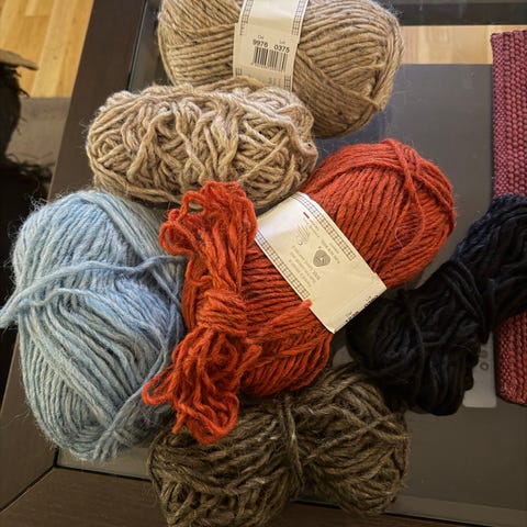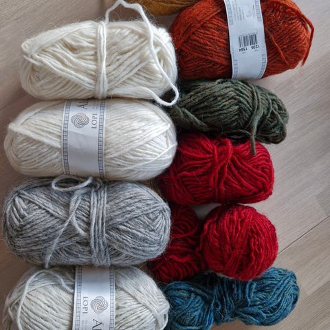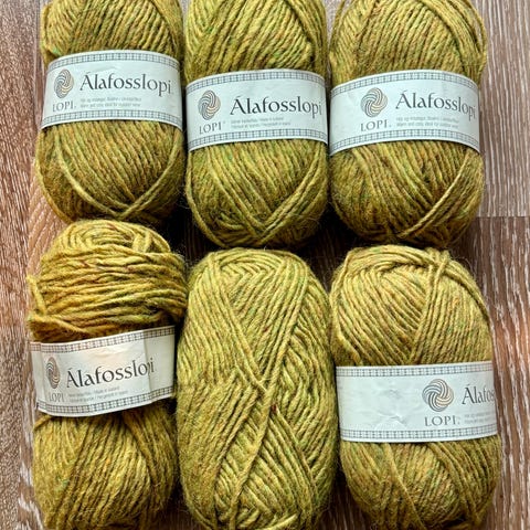 Alafosslopi og lettlopi nøster. En grå, svart og petrolblå Alafosslopi som er tatt noe garn av. Ellers er de helt nye.