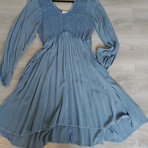 Oversized kjole i str S fra h&m Denim. Ble brukt når jeg var en størrelse storM/gravid, så den selges da den er for stor nå. Jeg er nå en litenM/storS, så en kan se hvordan den er på, på de siste bildene. Fargen er ikke så lys som de første bildene, fargen stemmer med bildene det jeg har kjolen på meg. Kun brukt 2 ganger og har ingen anmerkninger.