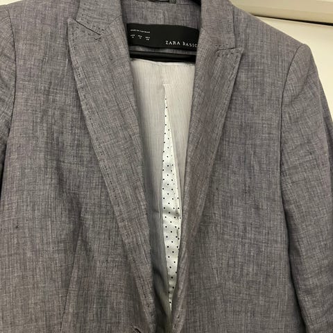 Zara Blazer i grønn farge, størrelse M. Laget av linmateriale, designet for kvinner. Blazeren har klassisk snitt med slag og lommer foran.