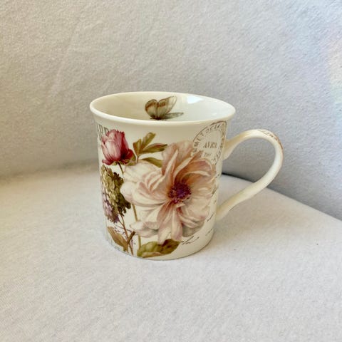 Selger en vakker kopp med nydelige nostalgiske blomster.