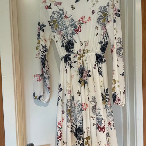 Nydelig kjole i 100% viskose. Hvit med blomster, knyting i nakken. Nesten ubrukt. Selges da jeg synes den blir for kort for meg