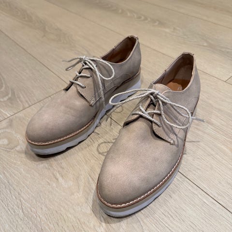 Mokkasiner og båtsko i størrelse 38 med grå farge. Skoene har en myk og fleksibel overflate med en dekorativ knute på toppen. Egnet for hverdagsbruk.