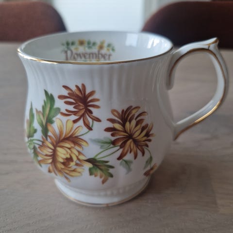 Selger en vakker kopp med nydelige nostalgiske blomster.