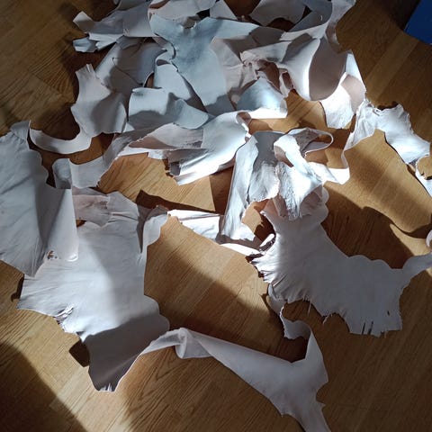Skinnrester i grått. Skinnet kan brukes til håndverk, reparasjoner eller andre prosjekter som krever skinn. Størrelsen og formene på skinnstykkene varierer.