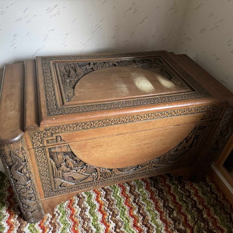 Vakker asiatisk kamferkiste fra midten av forrige århundre. Fint messingbeslag og utskjæringer.
