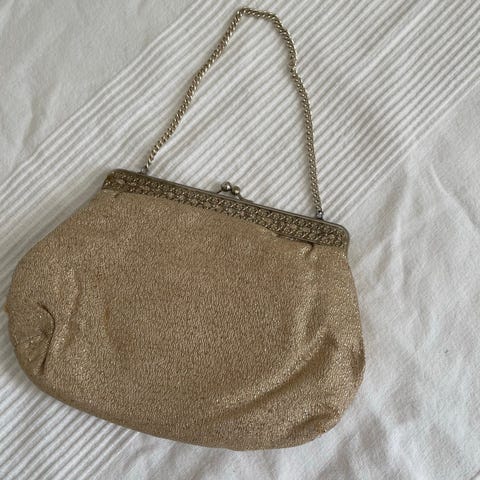 Etter min mormor selger jeg en glitrende, liten håndveske merket "Lærvarerådet made in Norway". Kan også brukes som clutch.