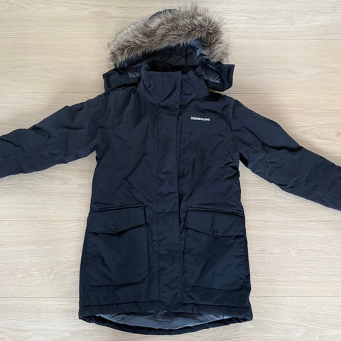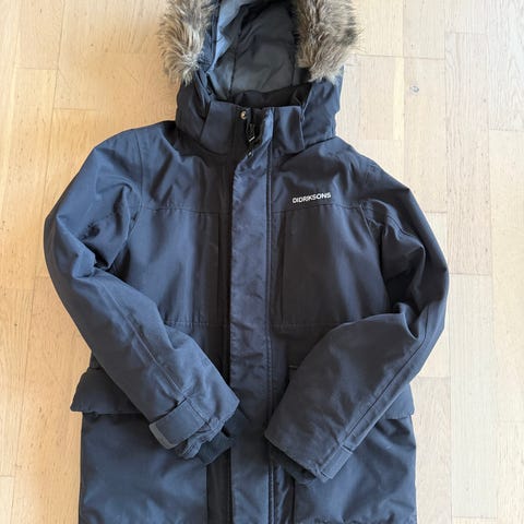 Selger en veldig fin blå Didriksons parkas i str 150. Jakken er fint brukt, og har ingen skader. Den er vattert, har 2 lommer og det er skinn kant rundt hetten. Hetten har justerbar reim., og jakken har justering i livet for å få den mer innsvingt. Jakken har en innerlomme i netting, og snøstopper på innsiden.