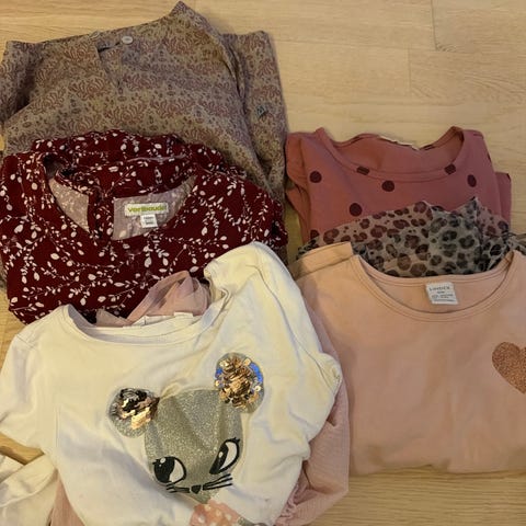 Genser med ballerinaer i tyllskjørt som står ut er fra Name it, den med piggsvin og paljetter har vi klippet bort størrelseslappen til, men tror den er fra Lindex. Den med påskrift LOVE er fra H&M.