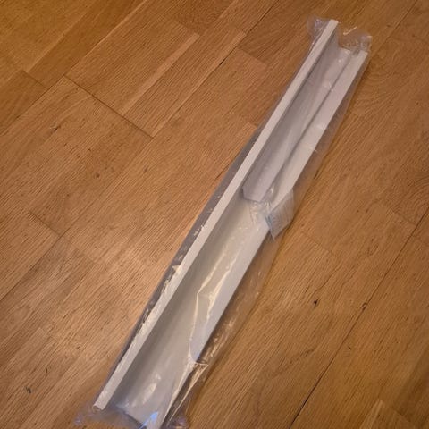 Selger 4 stk veggskinner med 8 stk knekt. Med veggskinner inkl knekt kan du lage dine egne hyller. Veggskinnene har en lengde på 50 cm. Alt selges samlet til 149 kr.