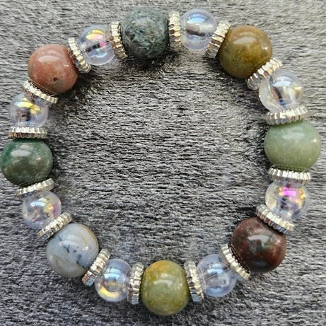 Søkeord: , halvedelsteiner, halvedelstener, naturmaterialer, naturstein, armbånd, smykker, perlearmbånd, jaspis, turkis