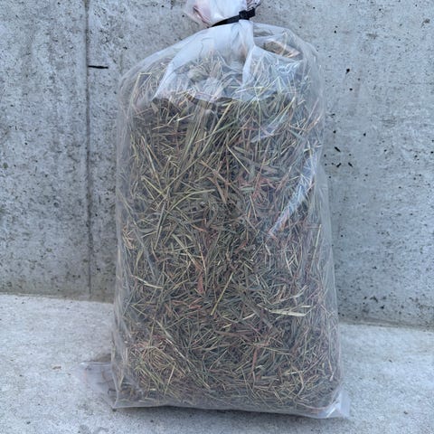 Tørket høy, pakket i store plastsekker.
