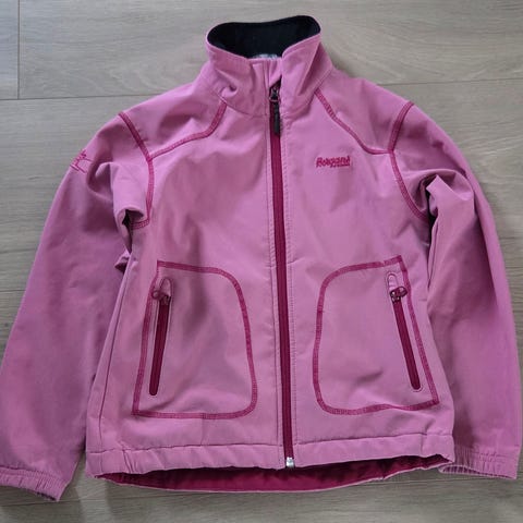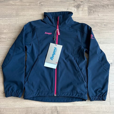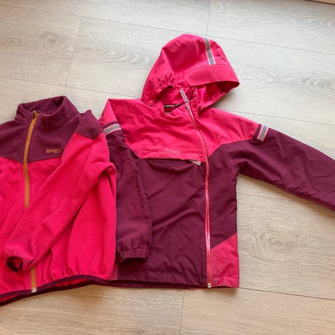 Bergans barn jakke og bukse i størrelse 128 for jenter. Jakken er med hette, glidelås foran og elastiske mansjetter. Buksen er med forsterkninger på knær og sete, samt knapp og glidelås i front. Passer til utendørs bruk og aktiviteter.